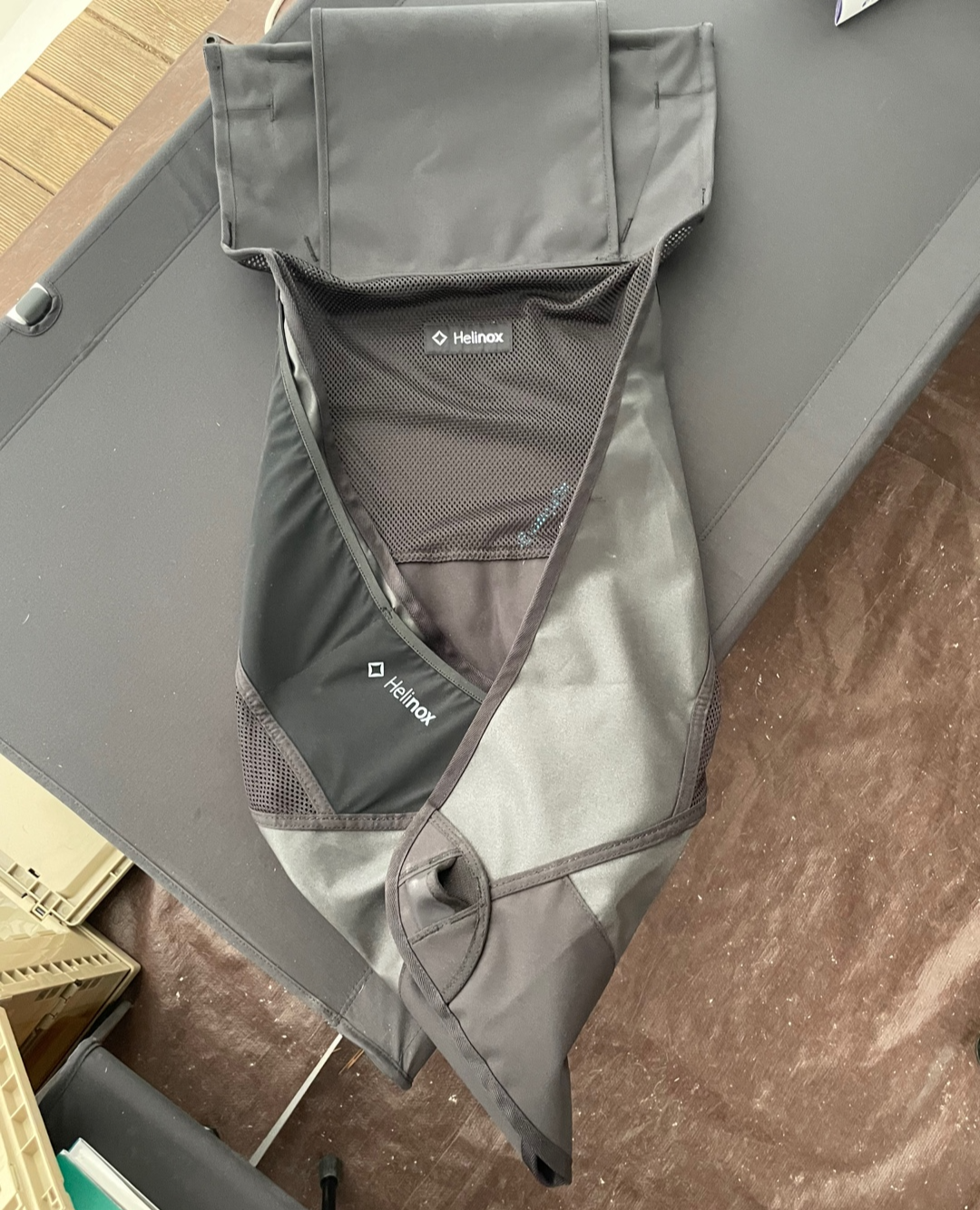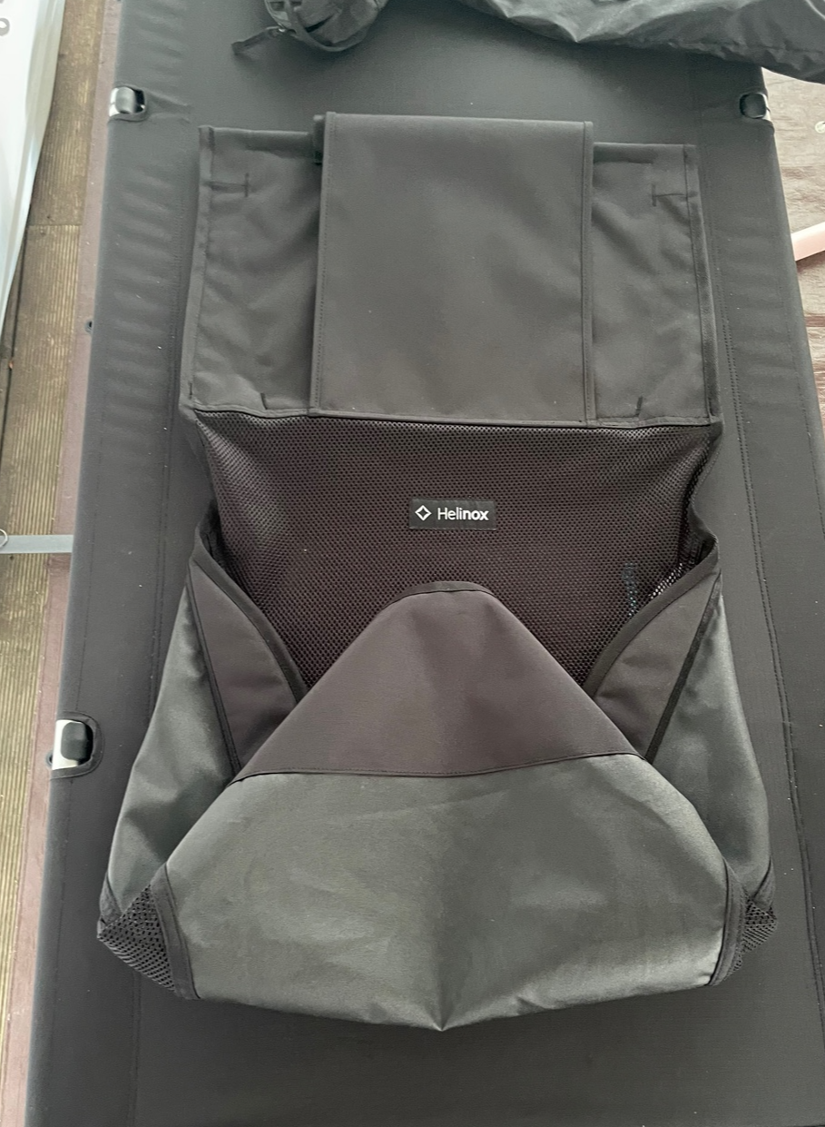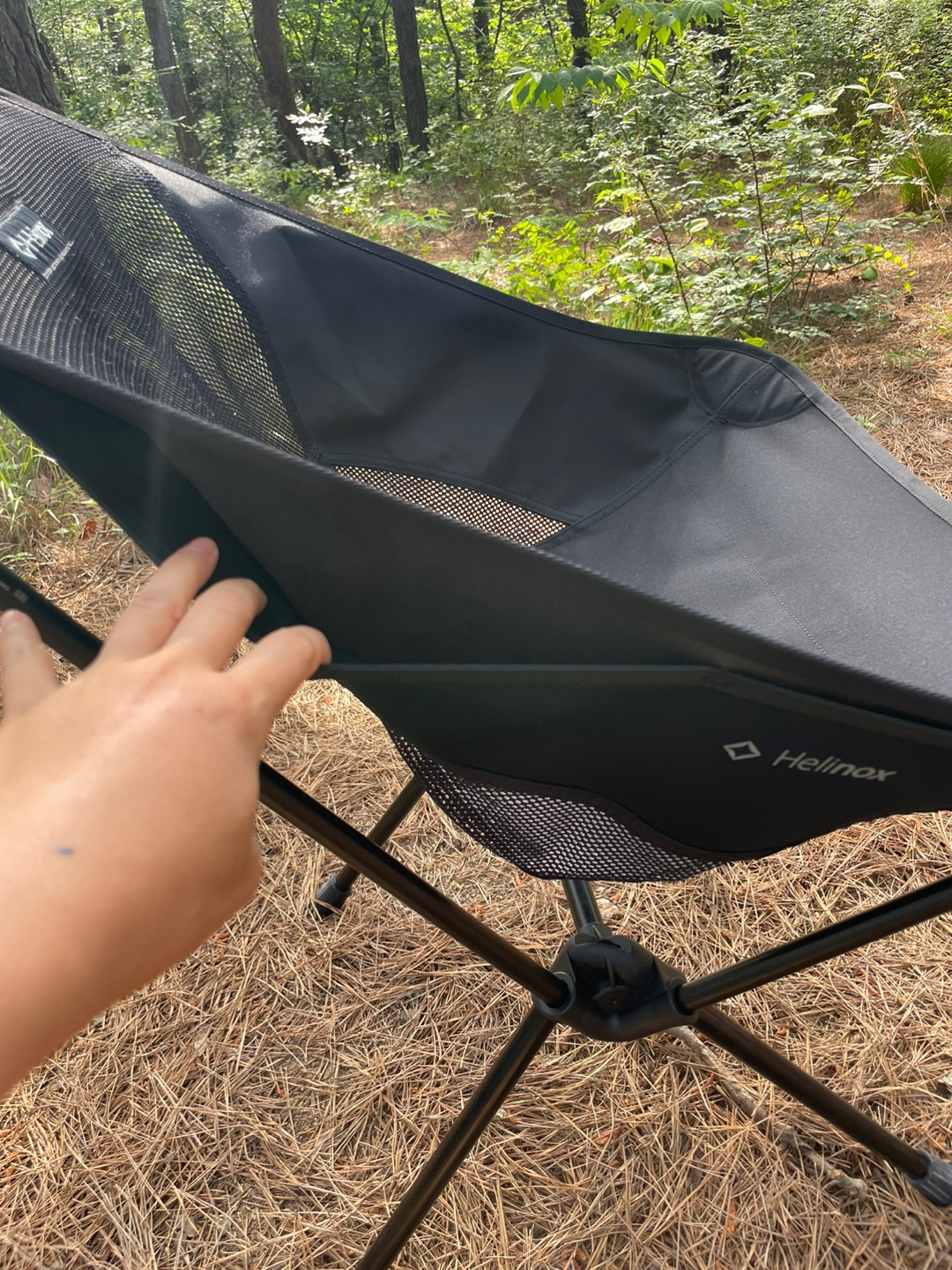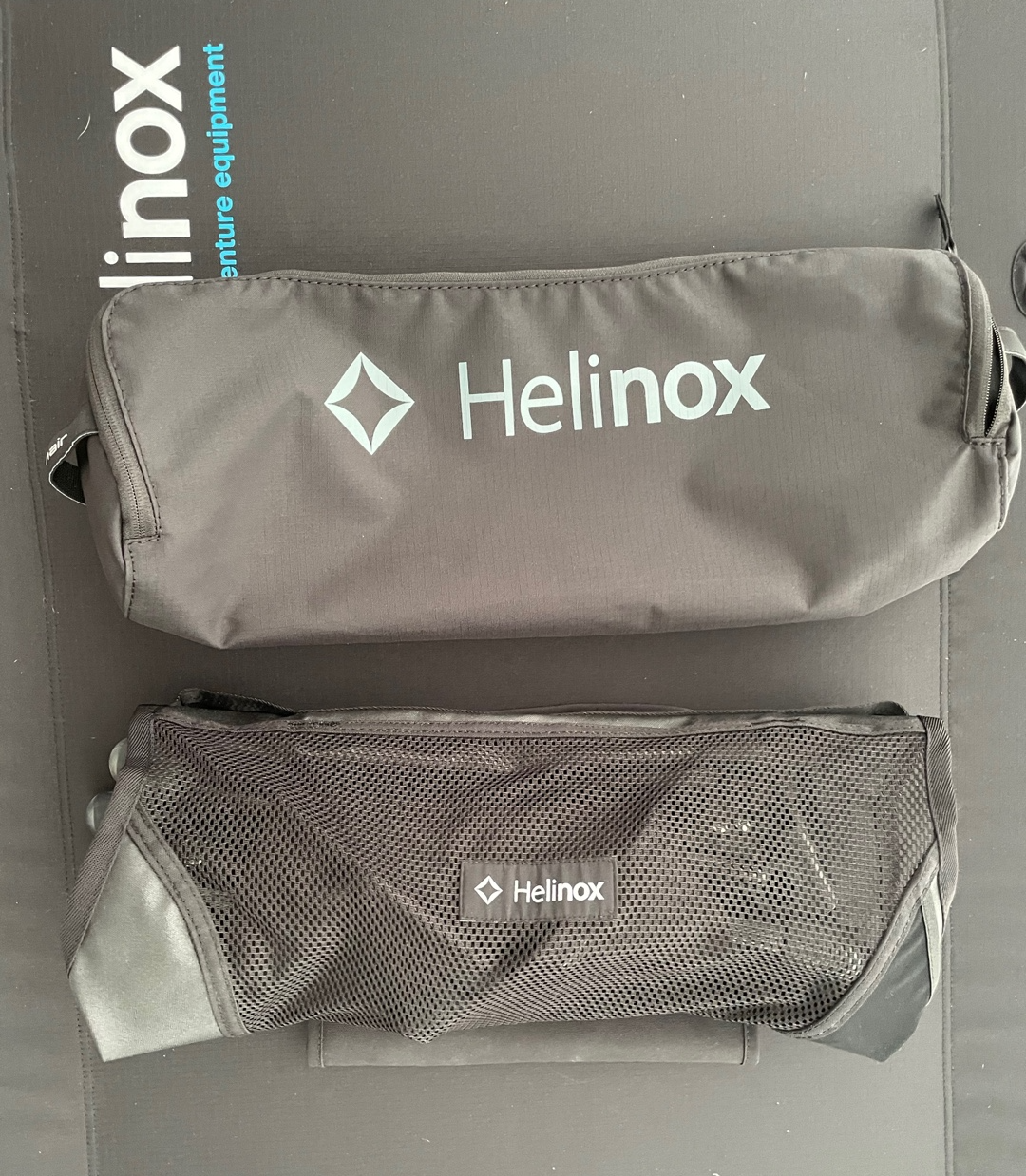 의자 옆에도 헬리녹스 로고가 있고 탄성이 있는 천으로 옆주머니가 만들어 져서 간단하게 소지품을 보관 할 수 있어요.